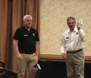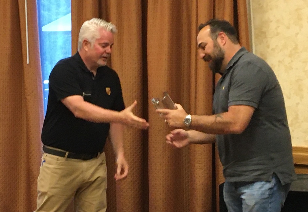 The third award was for the “First and Last Time Participant for a Yosemite Overnight Event”. This unique award went to Anthony and Mercedes Vierra, our Membership Chair. As it turned out, this was their first time at an overnight event, but, since they are moving to Idaho, it was his last Yosemite event, period! Brian thanked Anthony for his contributions over the years, wished him well and gave him his glass beer stein, etched with the Yosemite Logo, etc. The board will miss Anthony’s good humor, his on target insight to issues and his passion for Porsche. Brian then introduced Gary Loudermilk as the region’s Membership Chair. Please welcome Gary to his new position at the next event you cross trails at!