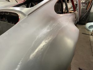 The type of work that true craftsmen do is amazing. It takes work and skill to build out proper flares on cars, like this one being worked up on a 911 (left). There were other, even more serious restorations in progress. One Mustang fastback was being almost completely rebuilt, with metal fabrication on the rear bumper and fastback. It is almost impossible to believe how such metal work could end up looking so beautiful. But Frank said “that is part of the problem”, because some shops without the craftsmen’s skill don’t do it correctly — to the point of being a scam job!